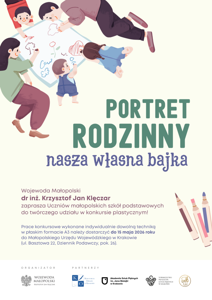 Ruszył wyjątkowy konkurs Portret rodzinny Małopolska, który zachęca dzieci i rodziny do pokazania swojej codzienności w bajkowej odsłonie. Inicjatywa Wojewody Małopolskiego to nie tylko zabawa plastyczna, ale także okazja do budowania więzi rodzinnych i rozwijania kreatywności najmłodszych. Konkurs już teraz wzbudza duże zainteresowanie wśród szkół i rodziców.