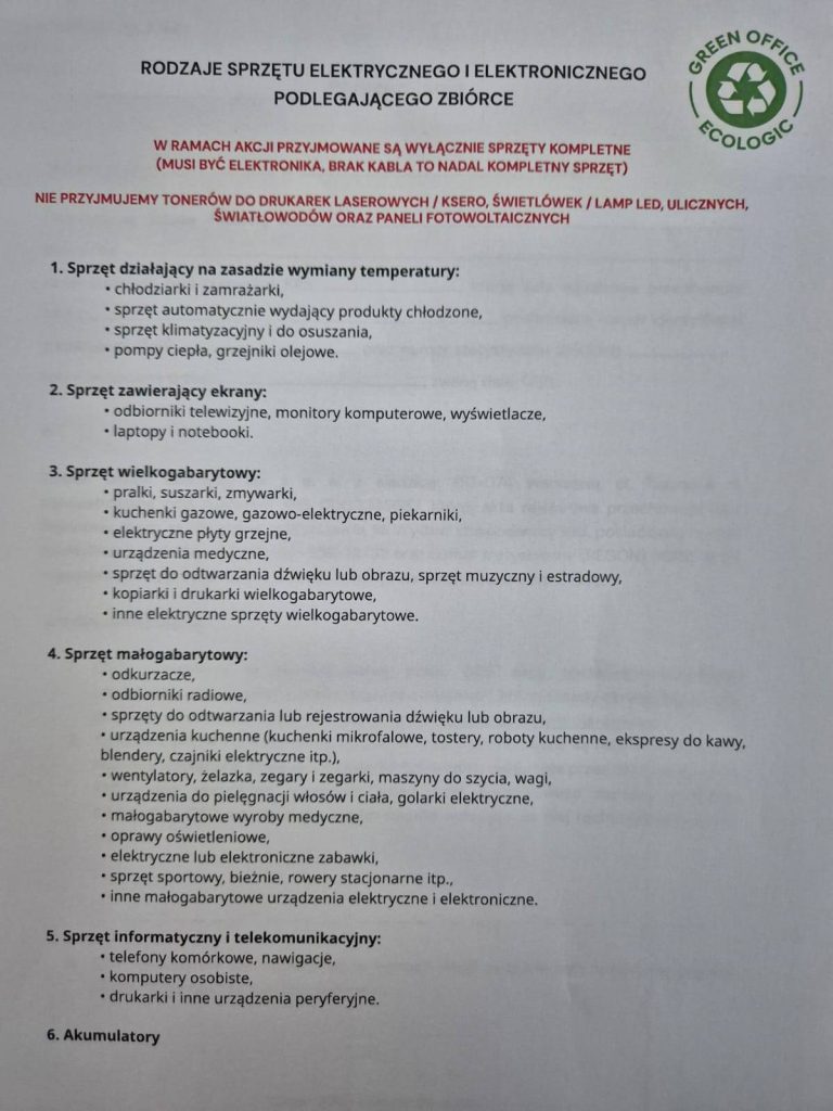 Do zbiórki można przekazać zużyty sprzęt elektryczny i elektroniczny działający na prąd lub baterie. Przyjmowane są między innymi:
